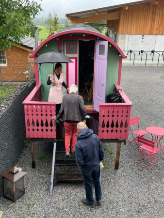 2021/ 2022: Nach einer erfolgreichen Erzählsaison bei Katja und Philipp Mäser (Coiffeur und Café in Marbach SG – Mäser im Feld (maeserimfeld.ch), suchte Carlotta einen überdachten Winterplatz. Der Grund: Die eine Seite musste dringend saniert werden und auch beim Dach und dem einen Rad gab es Lecks. Die Suche nach einem „Dach überm Kopf“ ging los. Zum Glück erklärten sich Sonja und Martin Fritsche vom Erlebnishof Steigmatt (Montlingen-Oberriet) bereit, die Carlotta bei sich unterzustellen. Während 3-4 Monaten wurde anschliessend gehämmert, geschliffen und gemalt. Im Sommer 2023 erlebte sie ihre erste Saison auf der Steigmatt. Um sie zu schonen, kam sie im Winter 23/24 wieder unter Dach. Im Frühjahr 2024 erhielt sie 2 neue Räder. Zu gerne wäre sie losgerollt um einen neuen Standort kennenzulernen. Nach einigen Abklärungen von Seiten der Betreiberin musste dieser Wunsch eingestellt werden. Vielleicht klappet`s das nächste Jahr und, ein weiterer Sommer auf der Steigmatt ist sowiso etwas wunderschönes. Kommt vorbei und überzeugt euch selbst! Es lohnt sich!